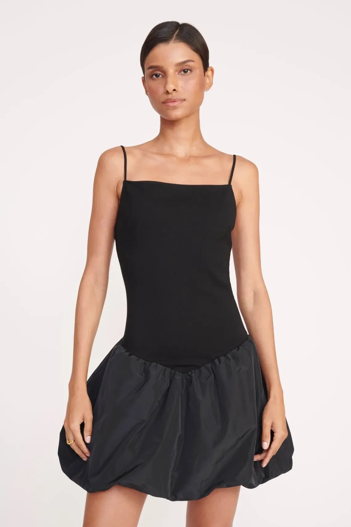The Ablee Dress is our perfect little black dress. It has a fitted ponte fabric bodice featuring a drop waist and a bubble hem taffeta skirt; perfect for cocktail party dressing.