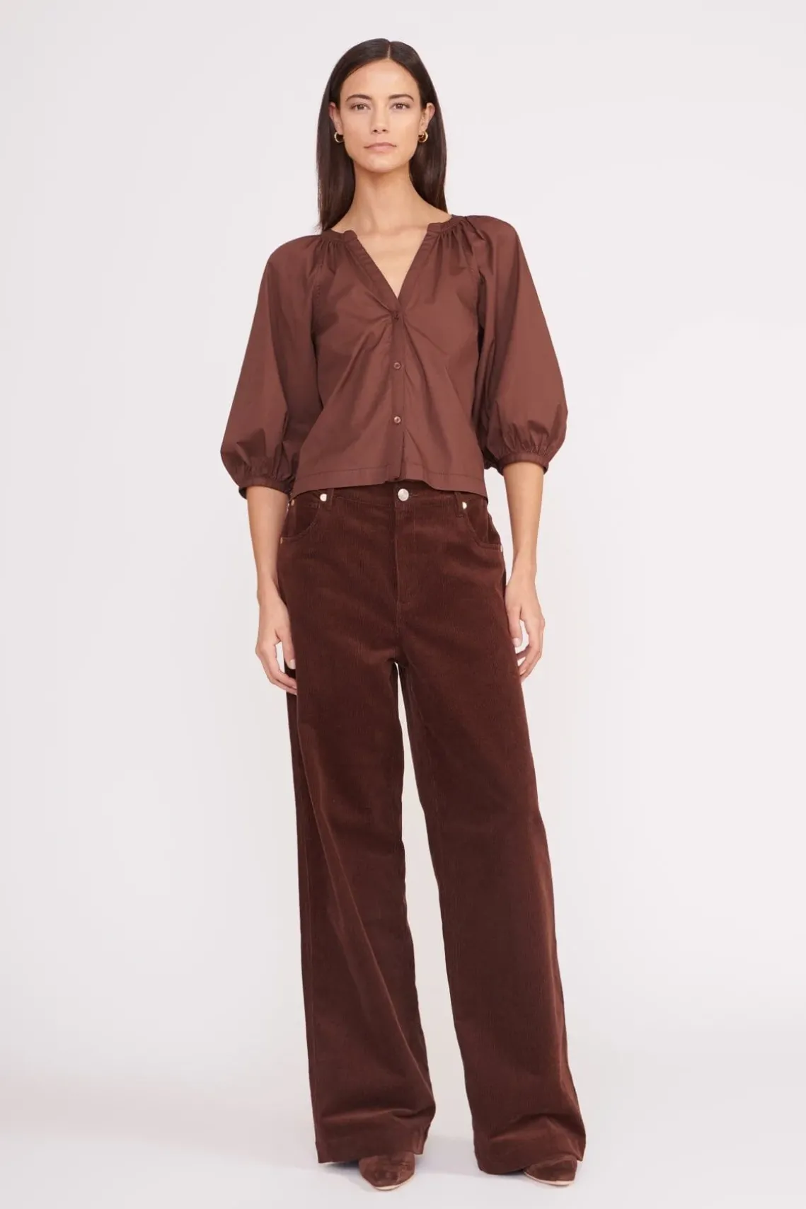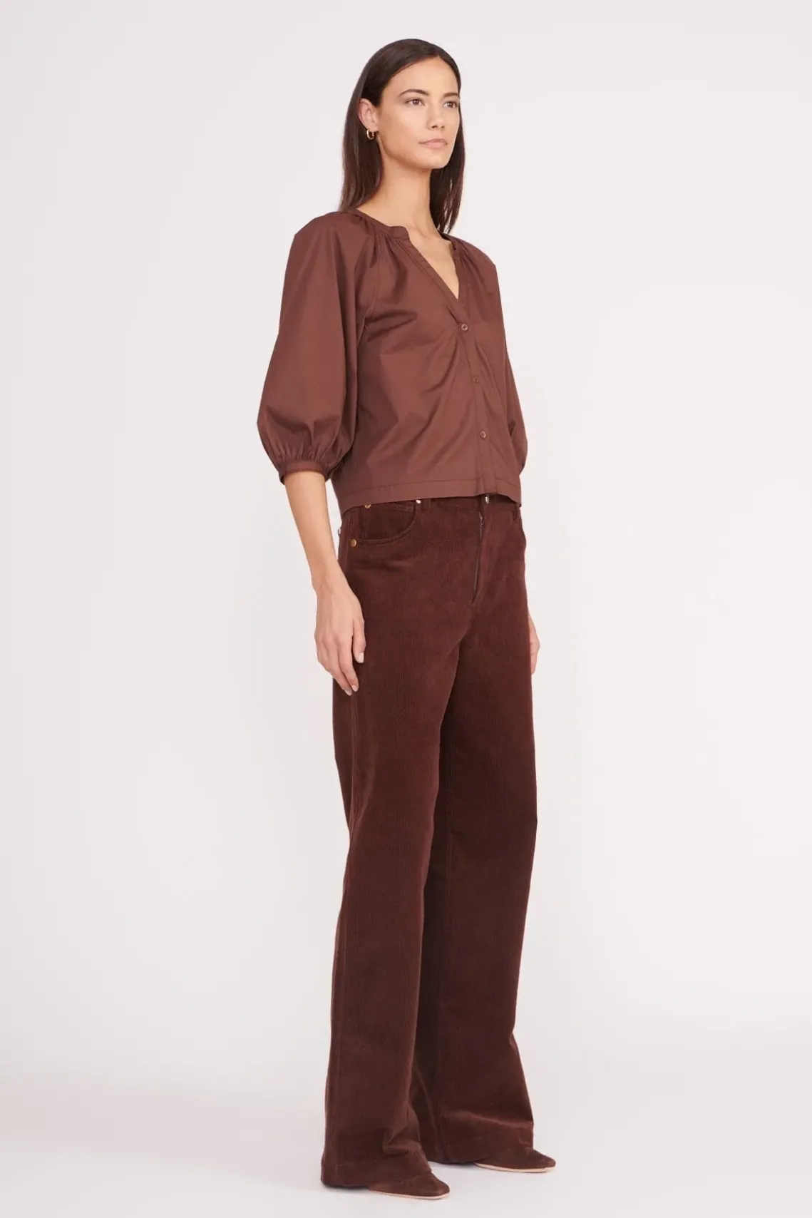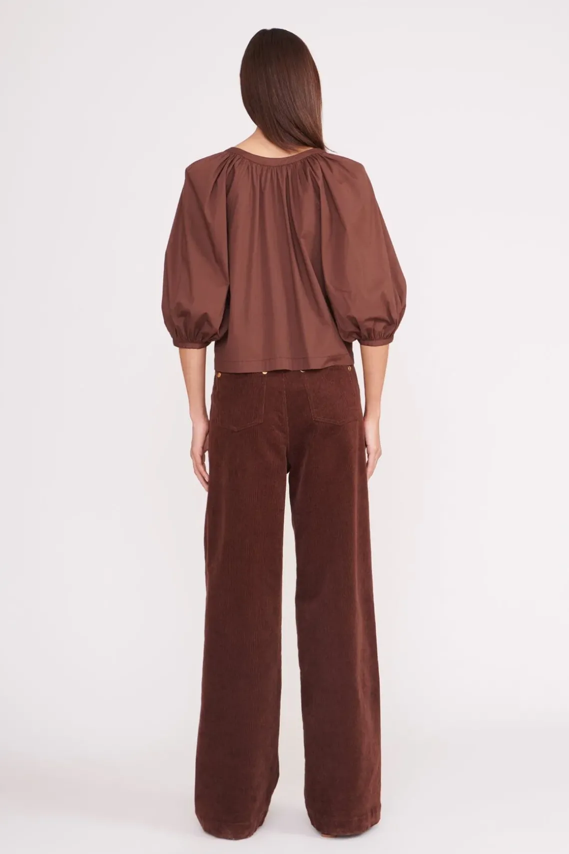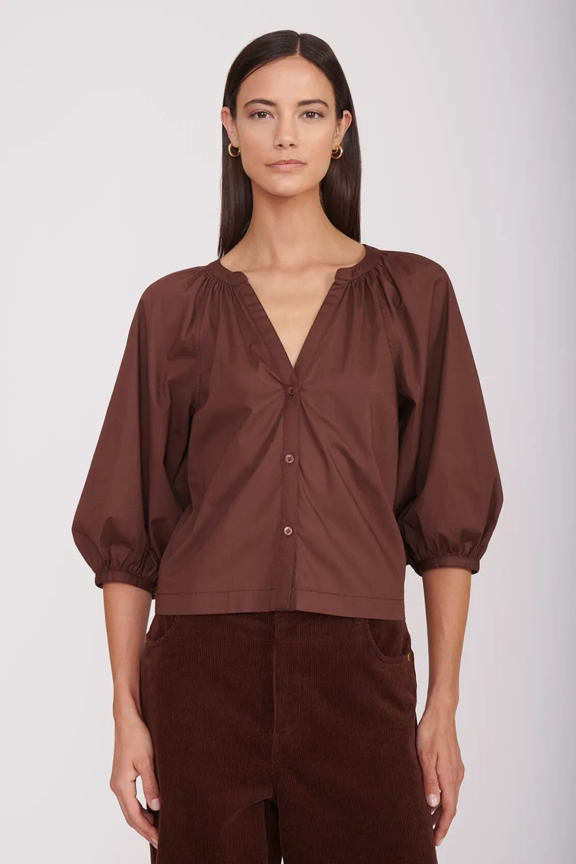 The Dill Top is a cotton poplin button-down with 3/4 puffed sleeves. This classic top can be worn year-round.