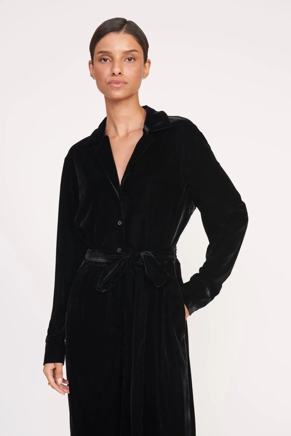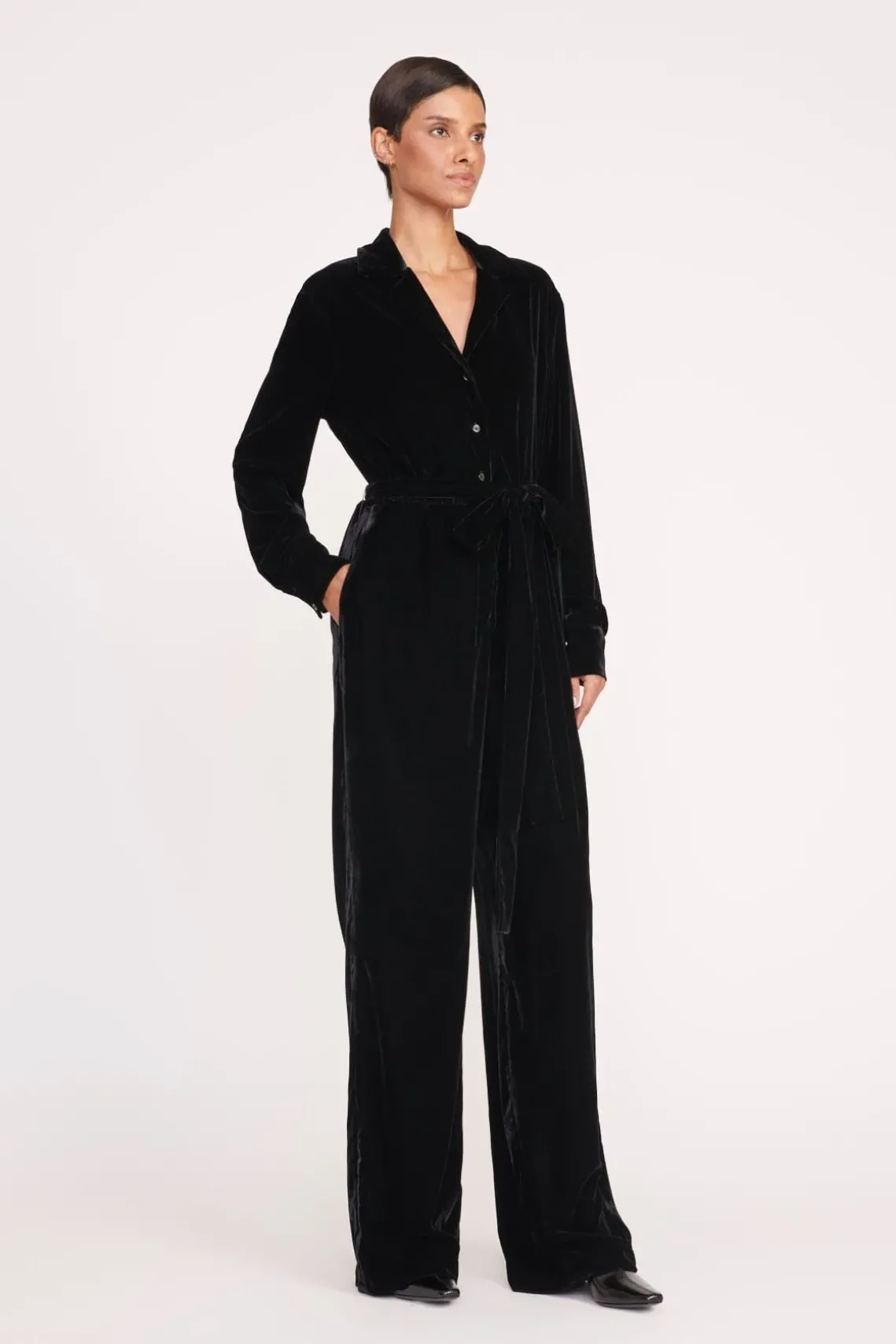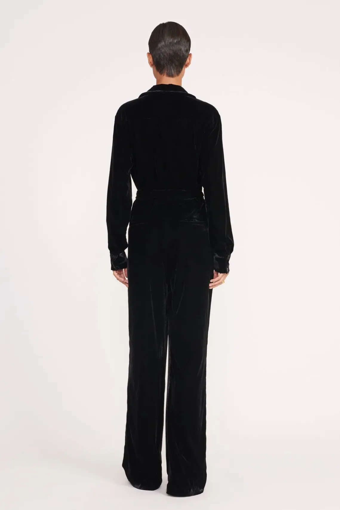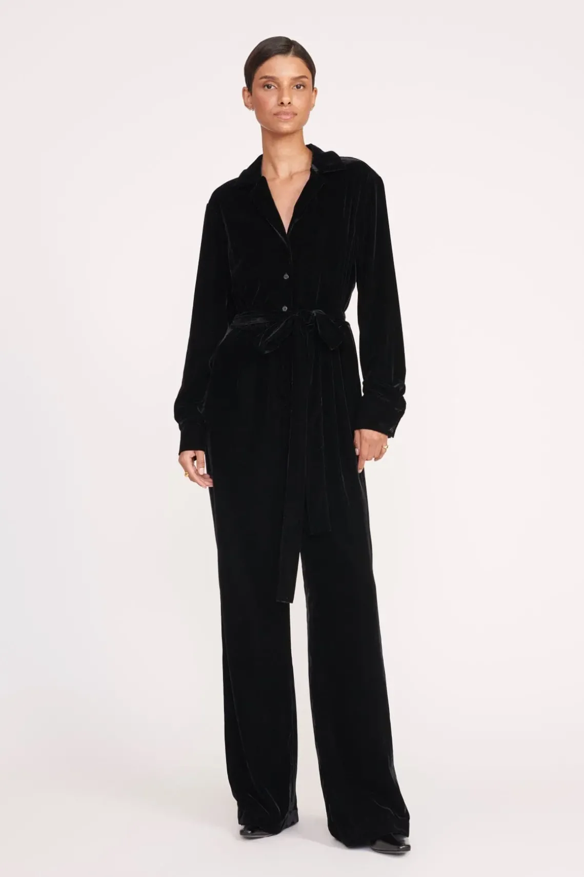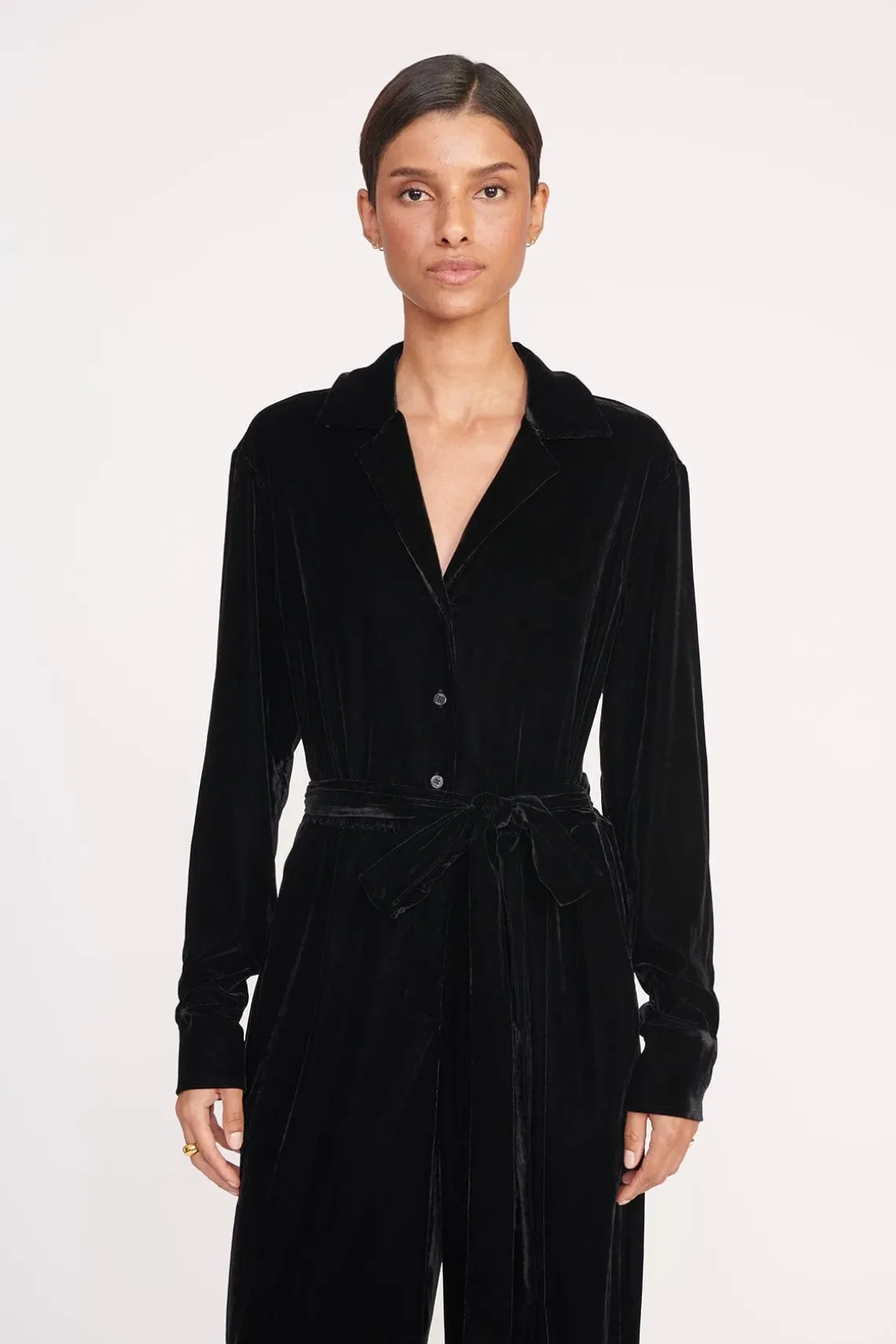 The Elijah Jumpsuit is a long sleeve jumpsuit crafted in our slinky velvet. This style features a button down front, collar neckline, and a tie at the waist.