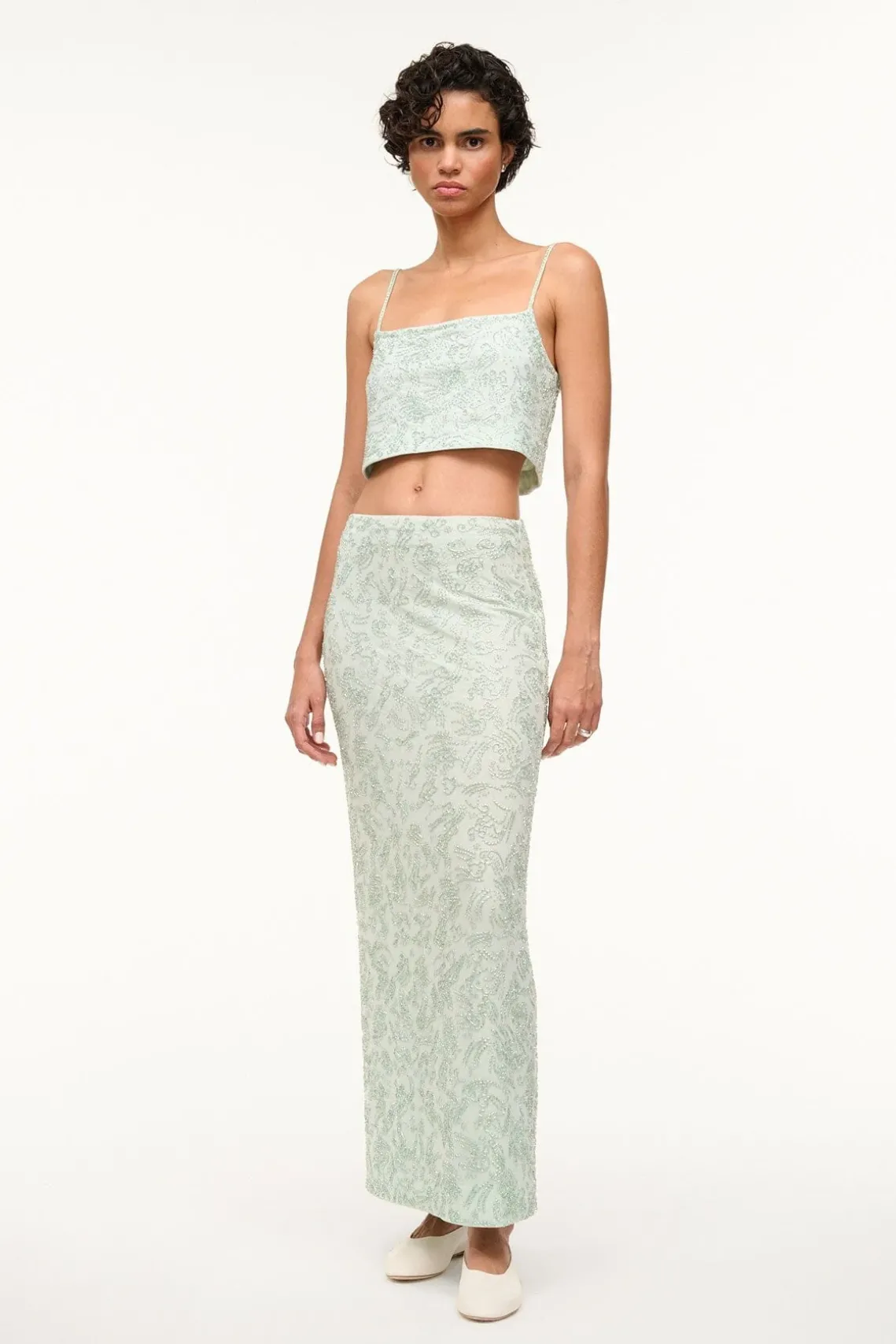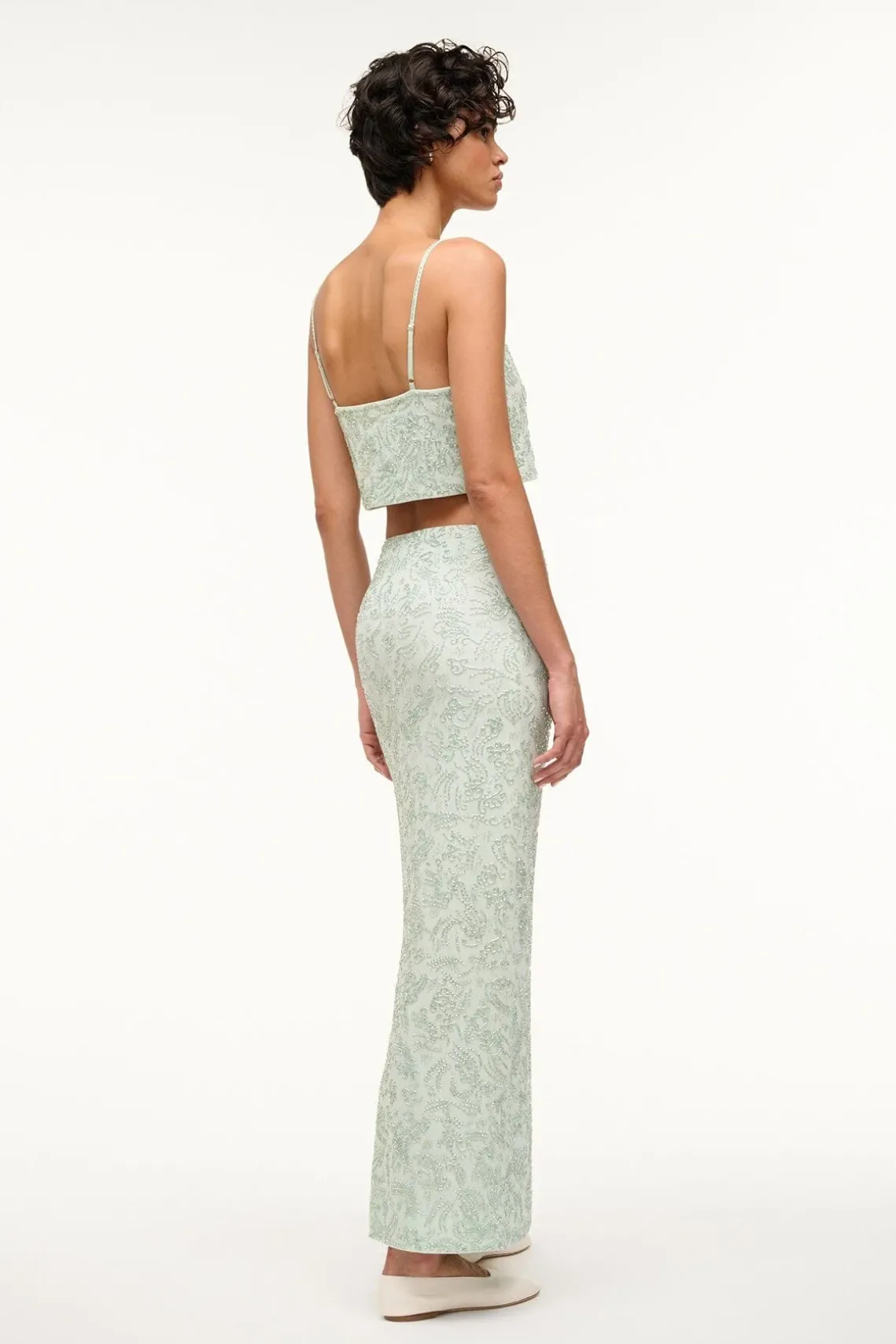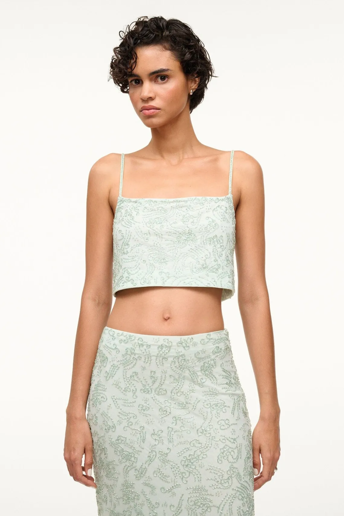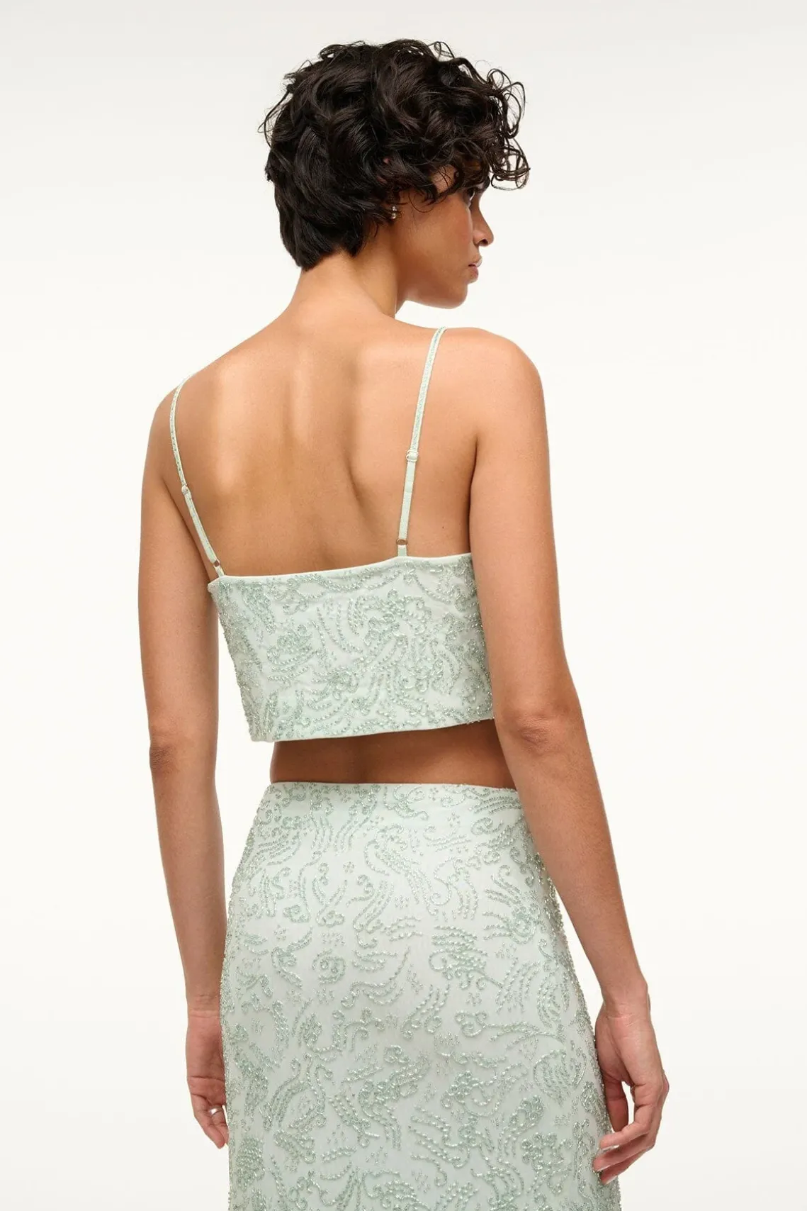 A beaded mesh cropped top, this style pairs back to our Barletta Skirt for a full beaded look. The Fermo Top features adjustable spaghetti straps, a straight neckline, and is cropped at the high waist.