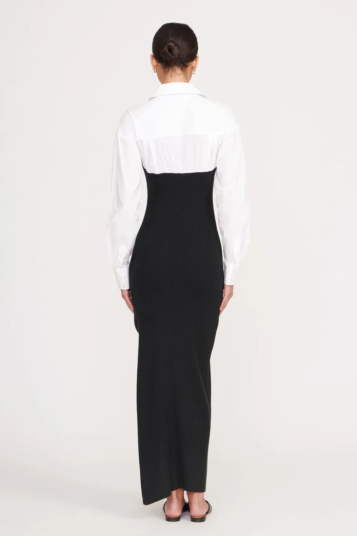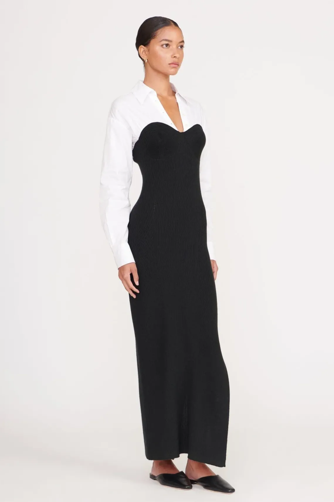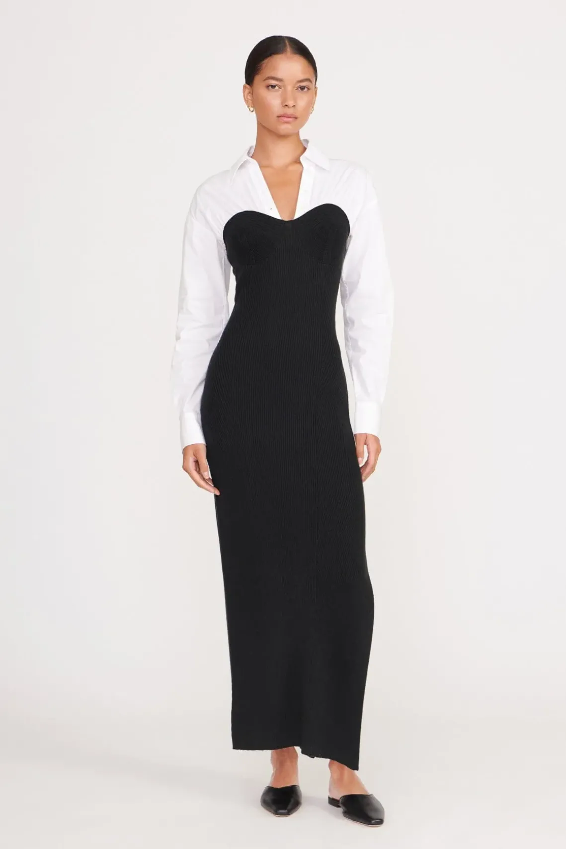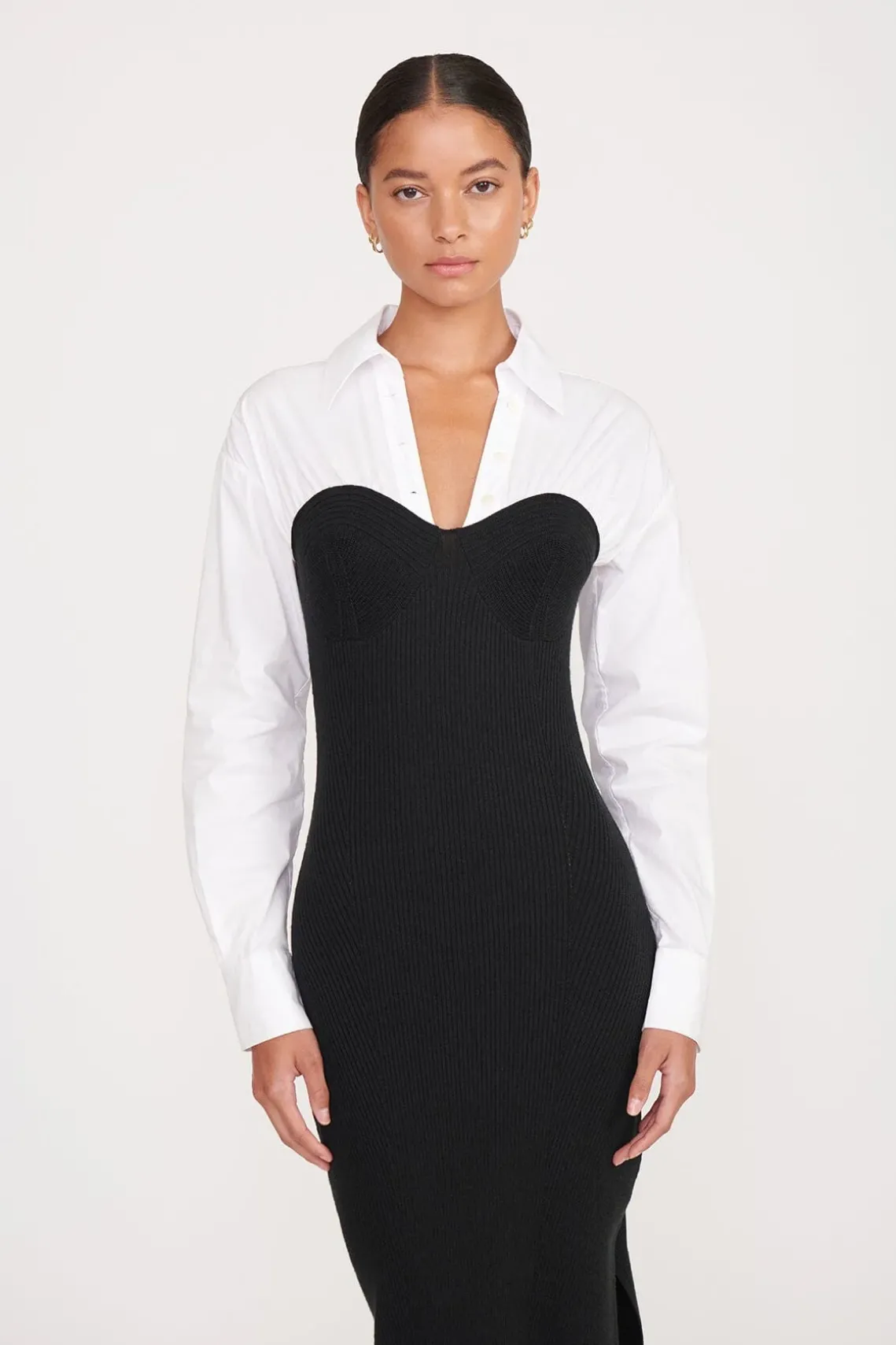 The Hazel is a poplin knit combo midi dress. The dress has fully fashion corset detailing attached to a long sleeve poplin shirt.