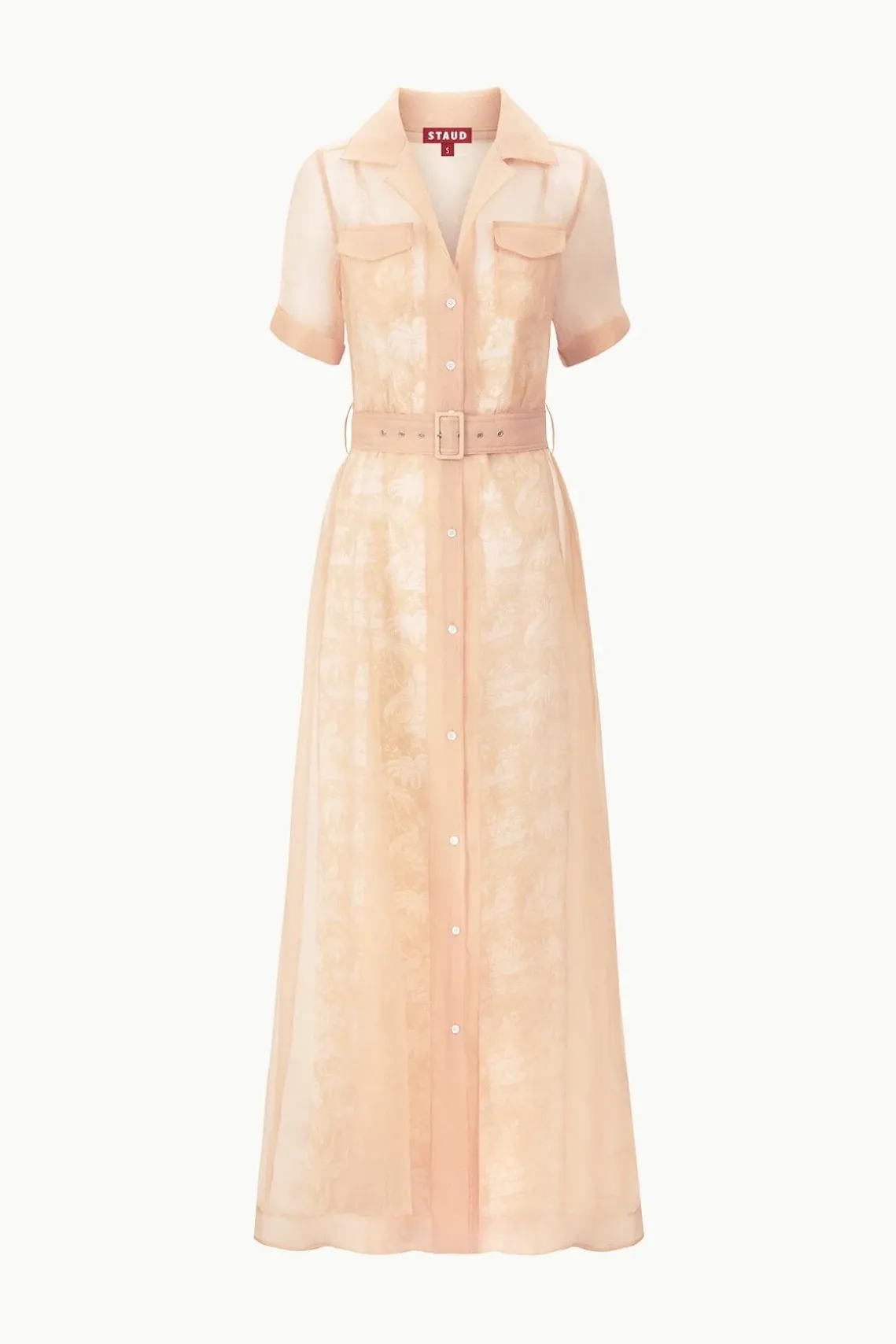 A full length, short sleeve dress with buttons down the front, this seasonal update to our classic wear-everywhere dress is made out of an organza shell and toile-printed poplin slip. The Millie features two chest pockets, a button down front and matching removable belt.