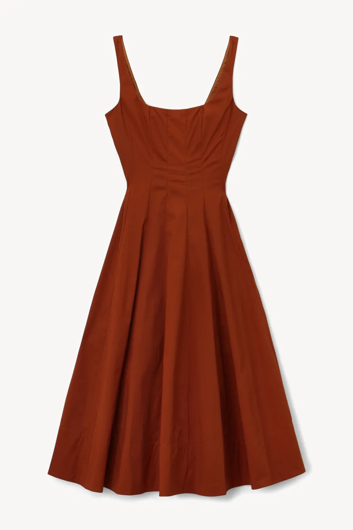 The Wells Dress features a corset-style panel construction to create a flattering, fitted shape through the waist and a midi length a-line skirt. Made out of lightweight cotton poplin.