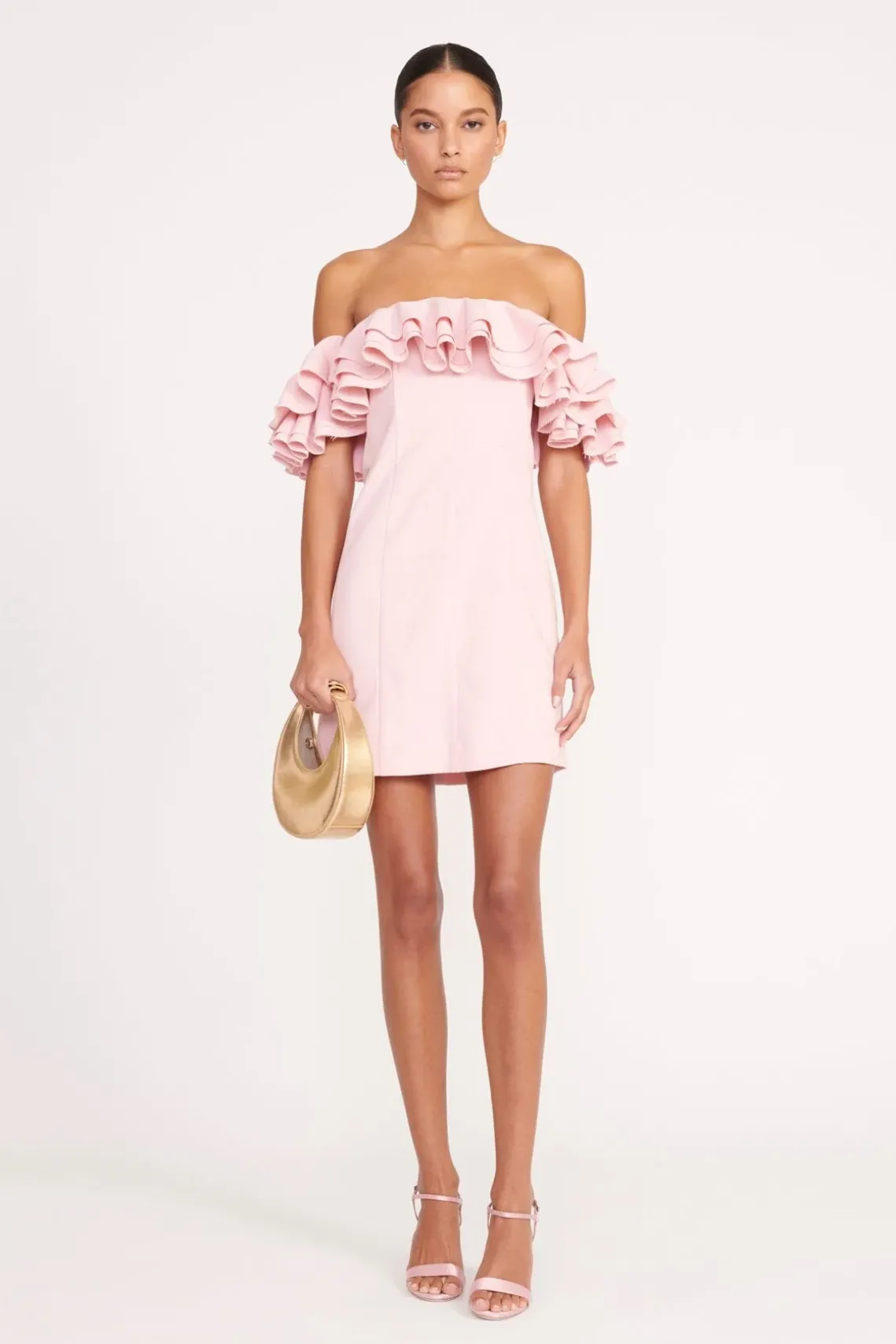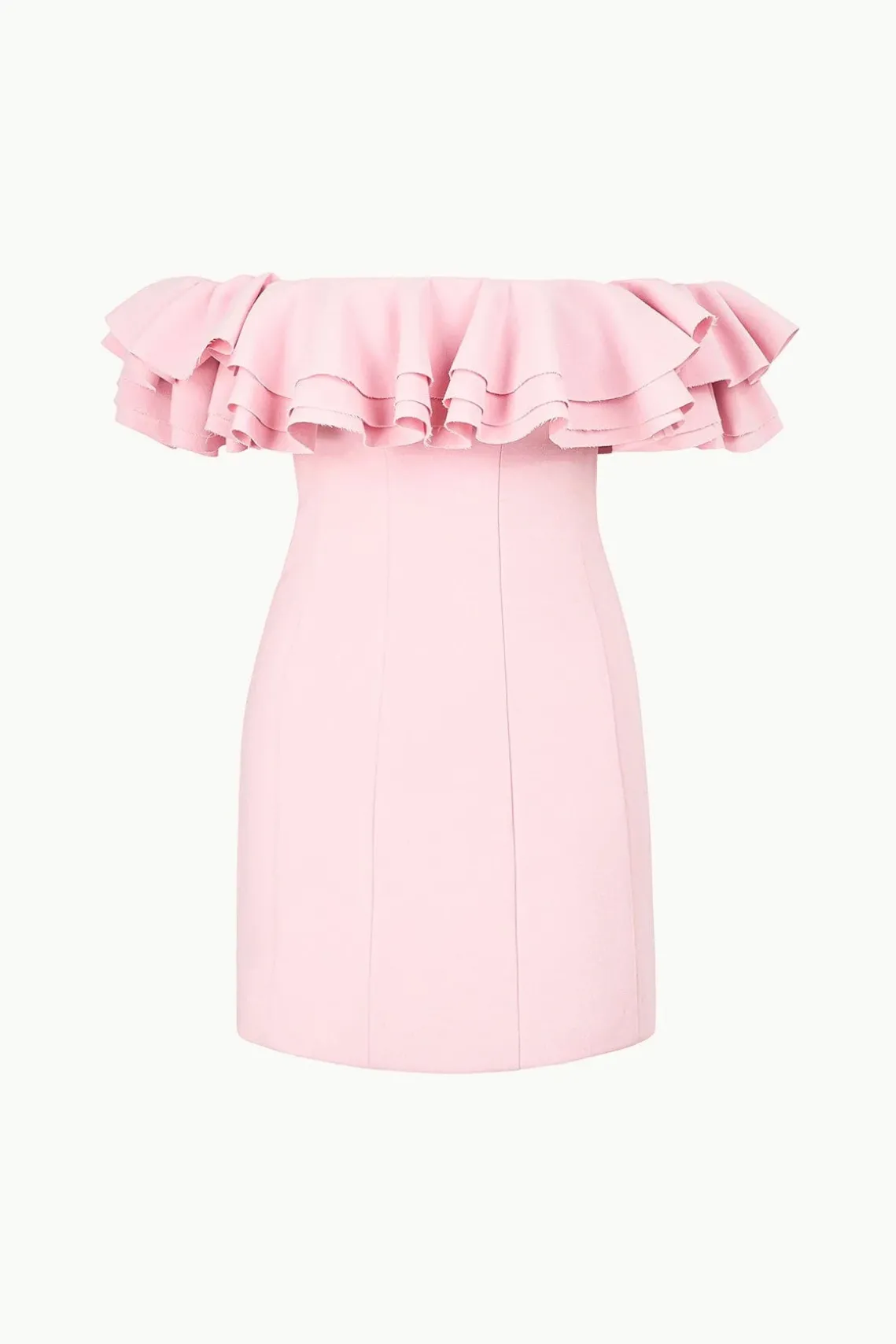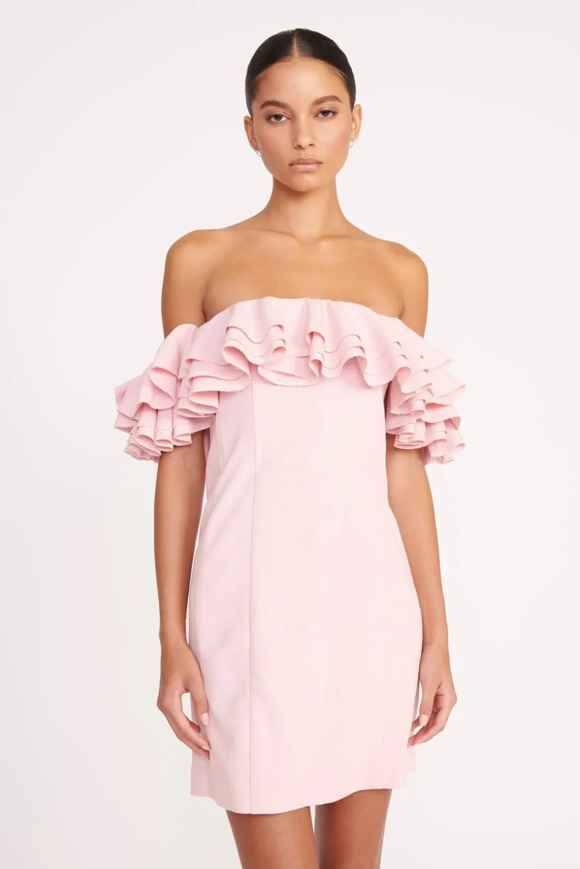 The Kiara Dress is a playful cocktail mini dress made in our tailoring crepe with a ruffle raw hem detail at the shoulder and chest. This style is fitted throughout the bodice and has a hidden zipper at the back.