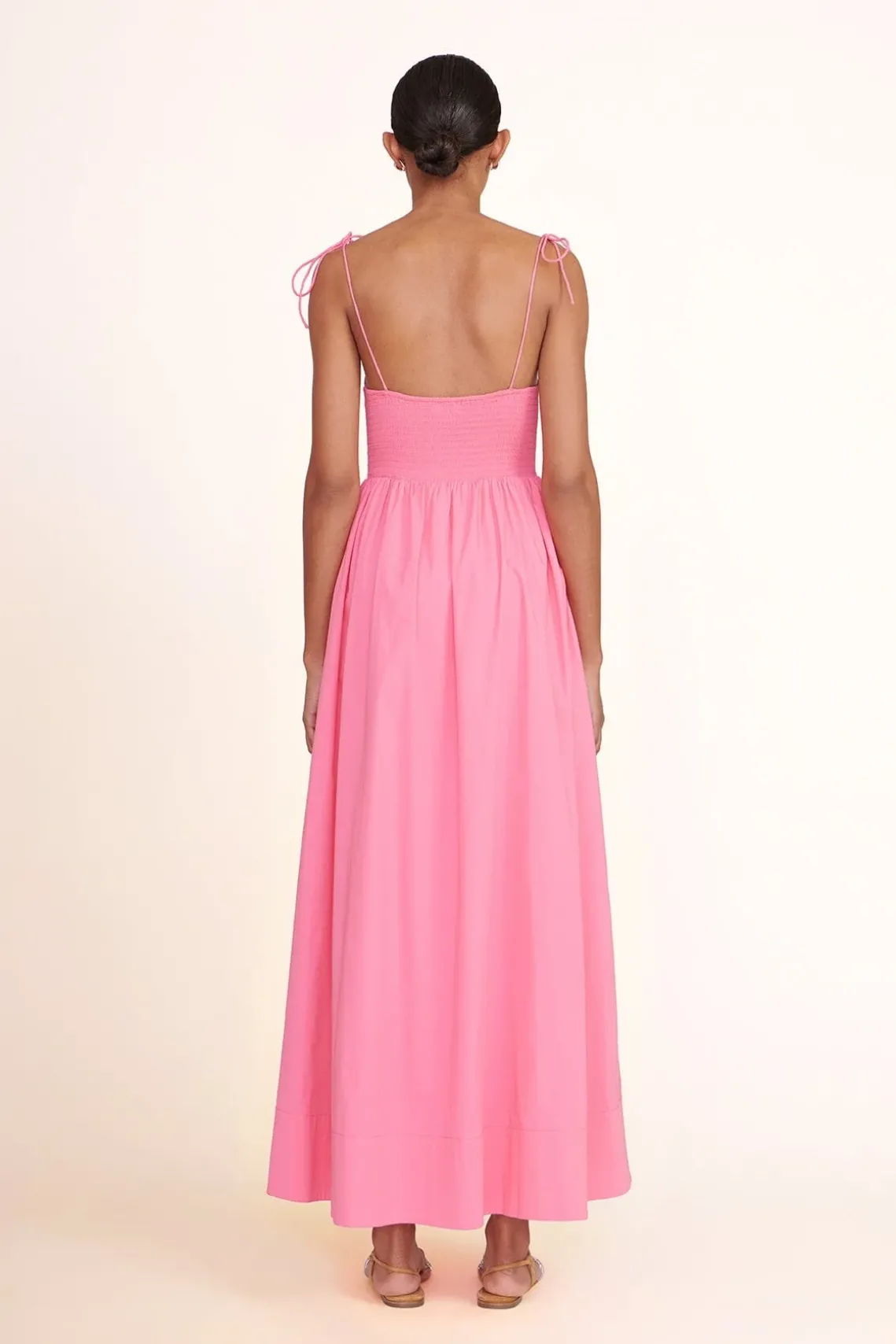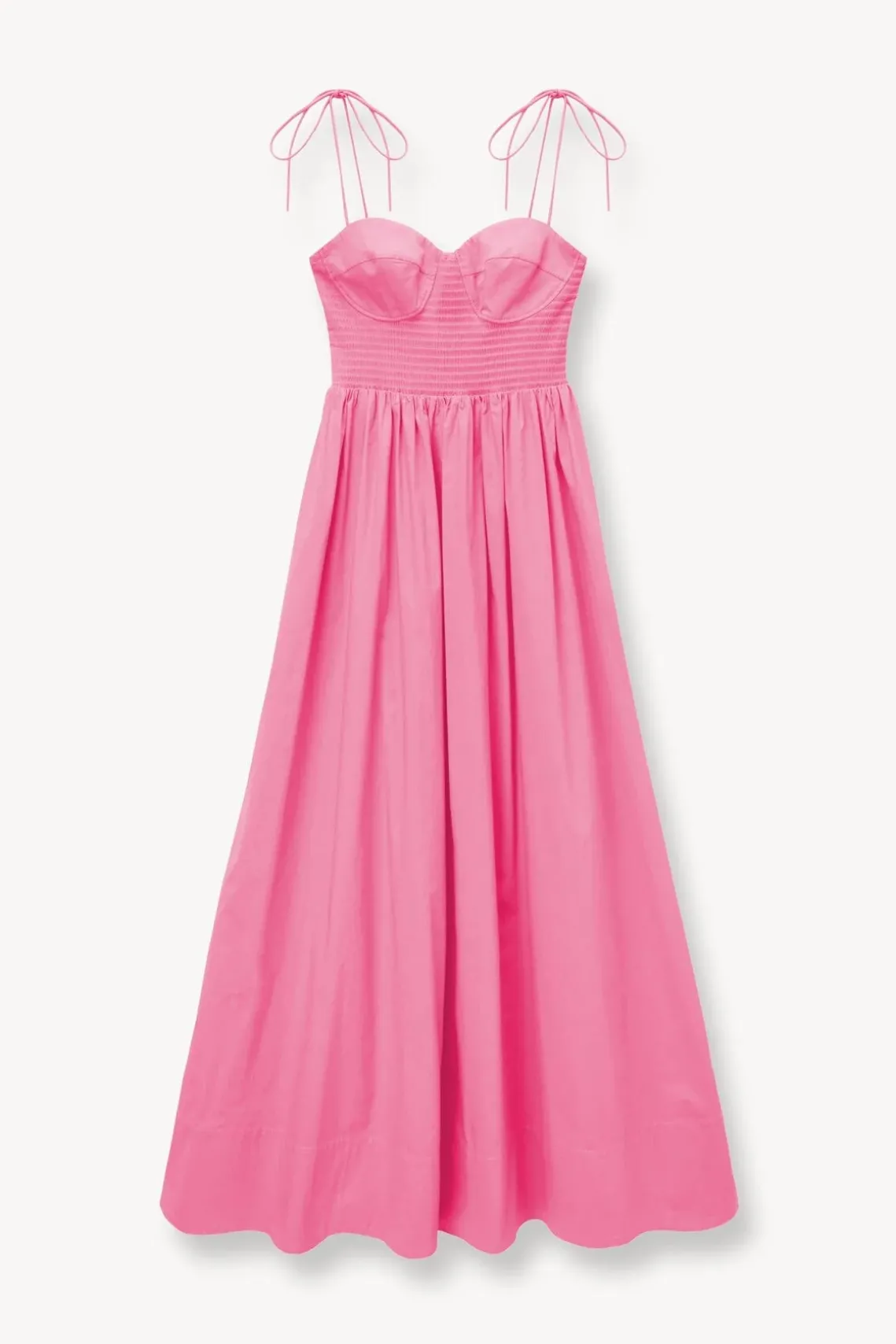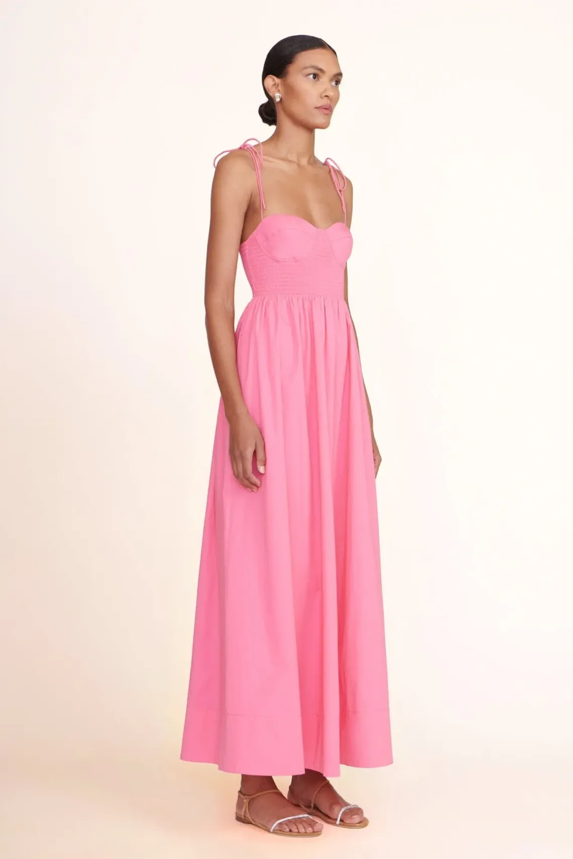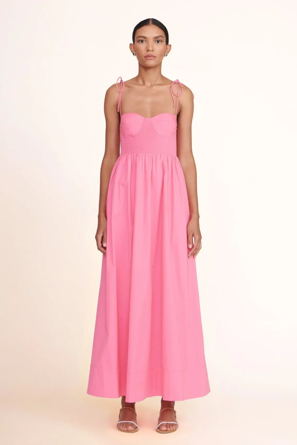 A cotton poplin maxi dress, the Landry Dress features a smocked corset bodice with adjustable tie straps. This style has a full skirt with shirring details and side seam pockets.