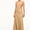 A classic slip-style gown, the Leonardo Dress is constructed out of a shiny taffeta fabric. This style offers an added statement detail with a side godet and train. Featuring a v-neckline, thin spaghetti straps and low back.