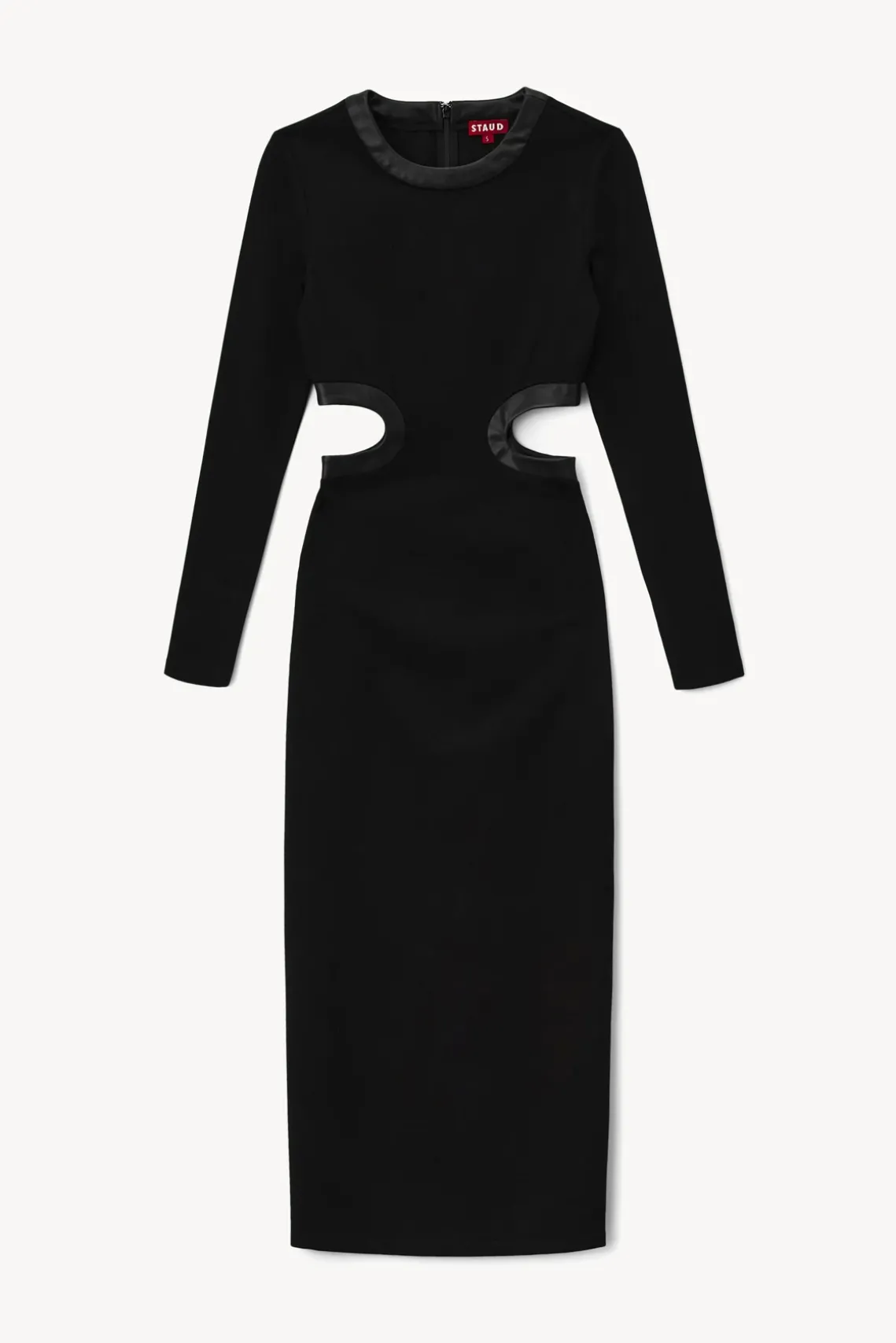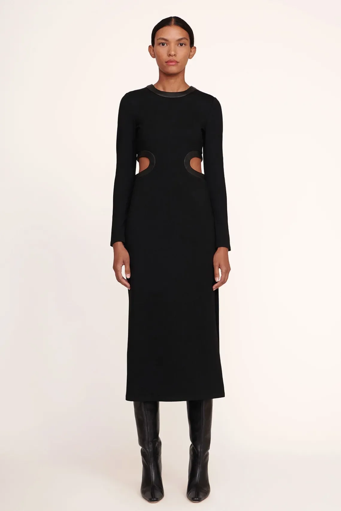 A long sleeve, tonal update to our bestselling dress. The Long Sleeve Dolce Dress is a full length ponte dress with waist cutouts, side slits a back zipper closure and vegan leather trim.