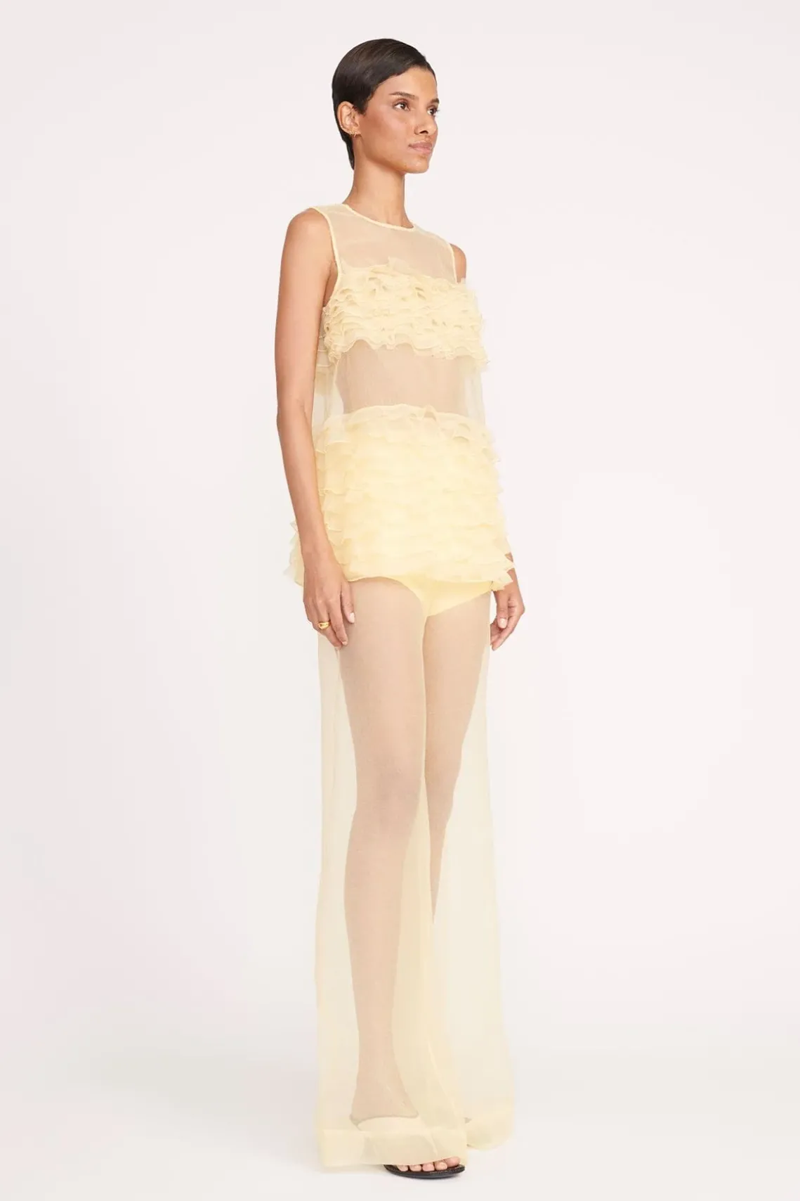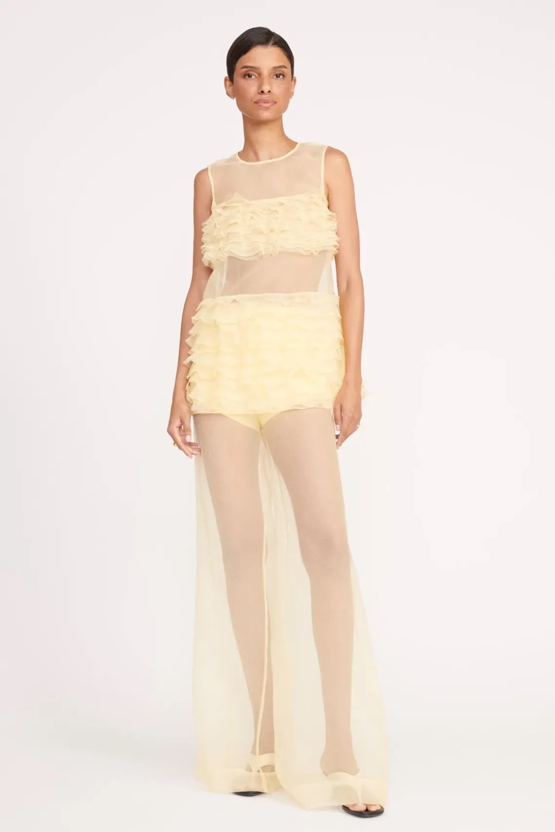 A sheer organza top that hits at the hips, the Myrtle features ruffle details at the bust and waistline. Wear as a set when paired with the matching Luke Pant.