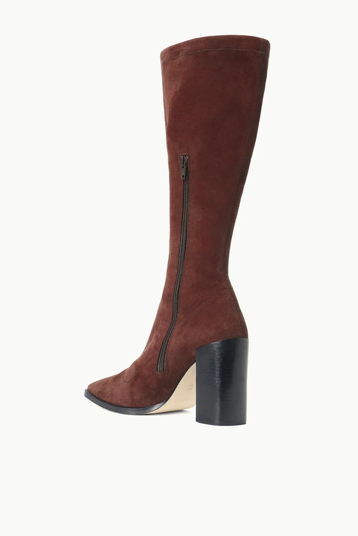 The Paz Boot is a stretch suede boot with a stacked heel. This style is a knee-high boot, perfect for pairing under trousers.